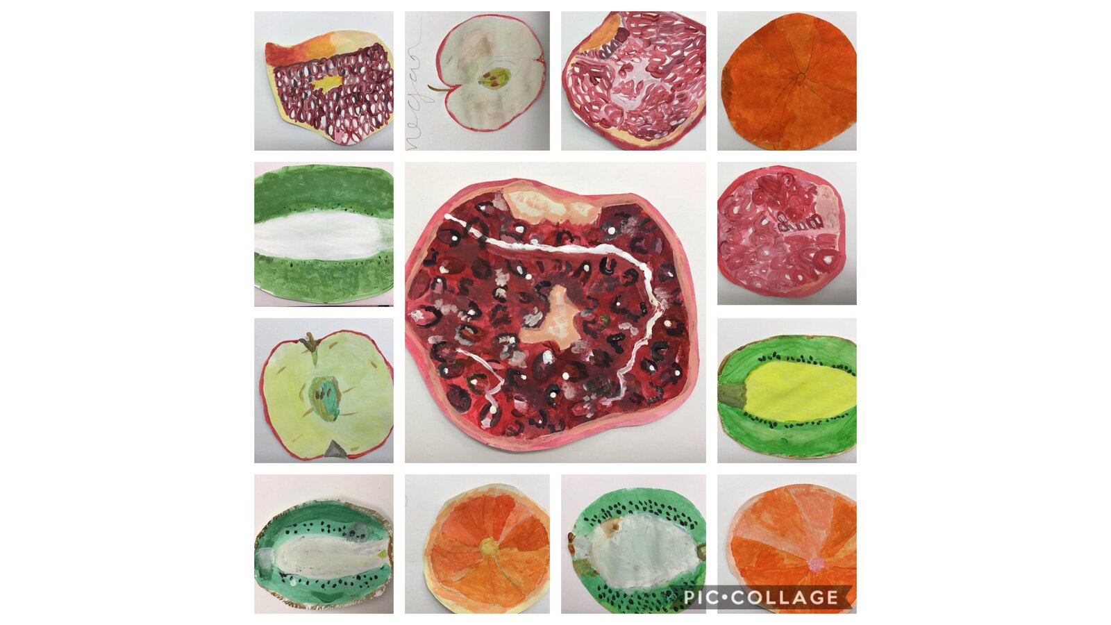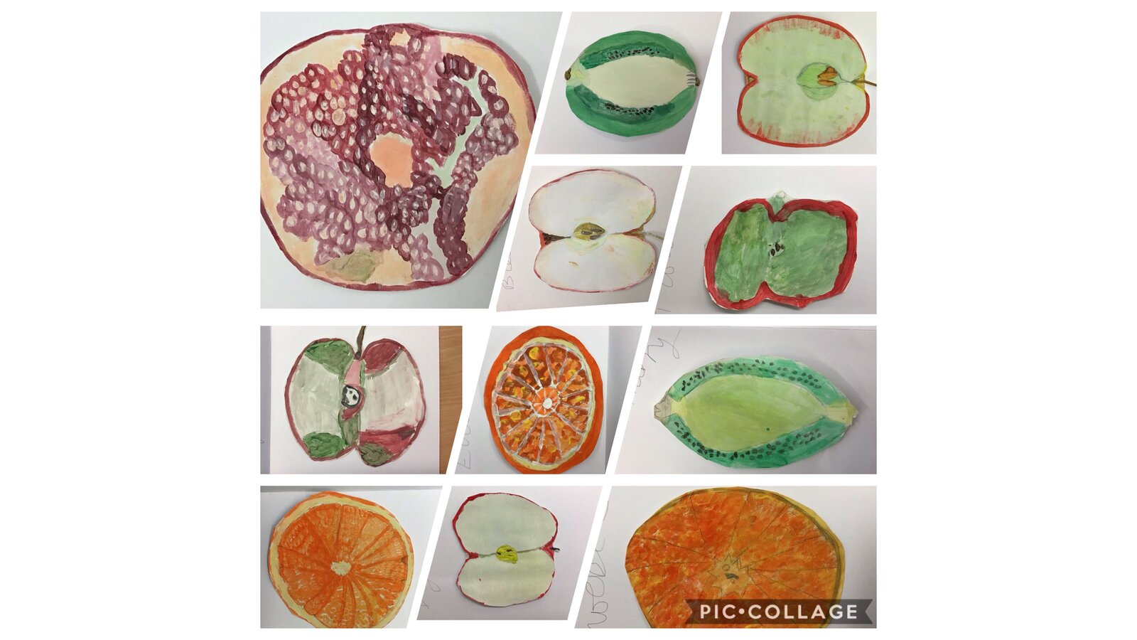 Year 5&6 have been practising their observational drawing and painting skills with a study of dissected fruit. They focused on capturing detail accurately and colour mixing to replicate colours in natural objects. They photographed their finished paintings and used the ‘paint’ app to layer multiple copies…