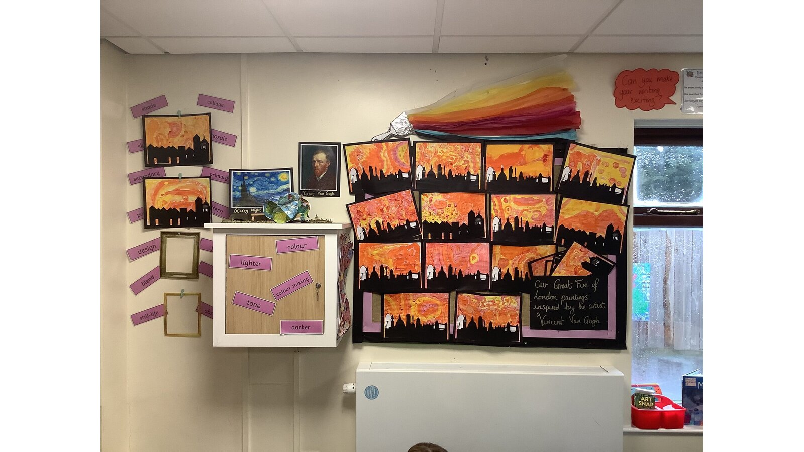 KS1 created Great Fire of London pictures inspired by Vincent Van Gogh Starry night.