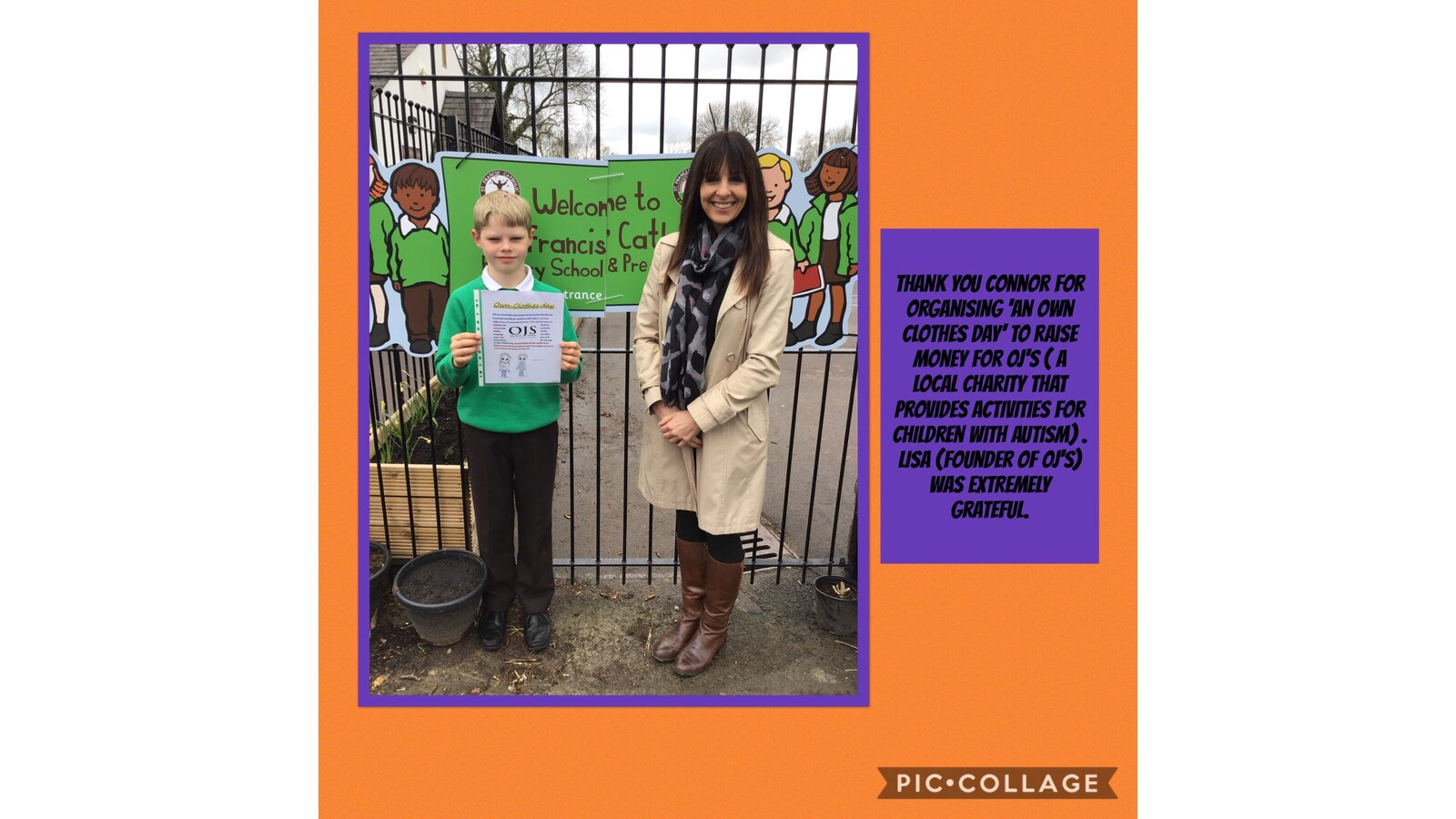 We raised £100 for Children In Need – after having a sponsored own clothes, spotty day. Well done everyone!