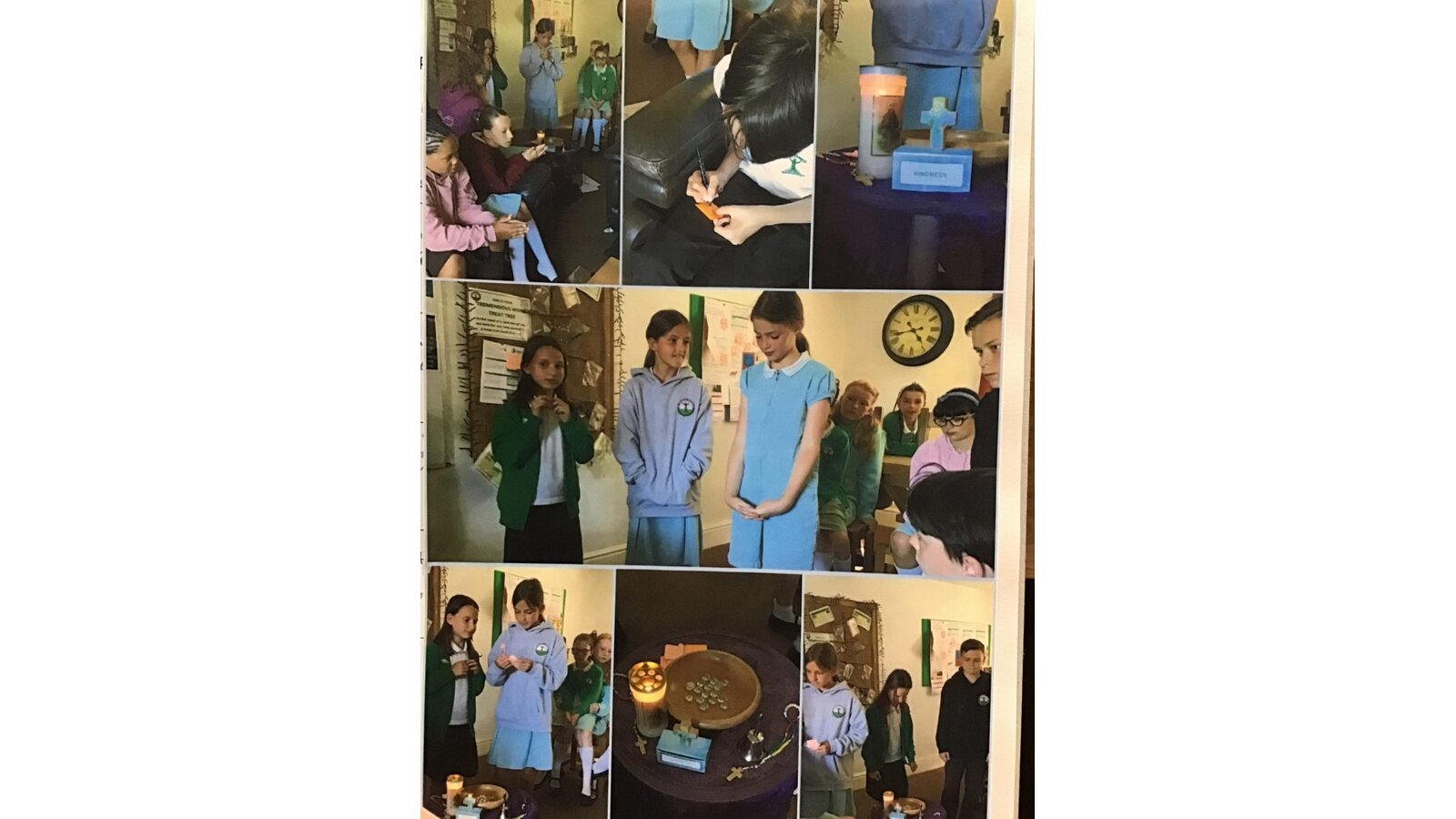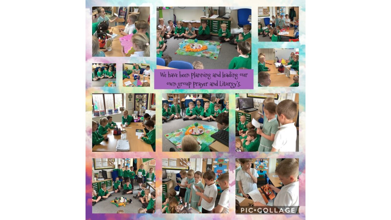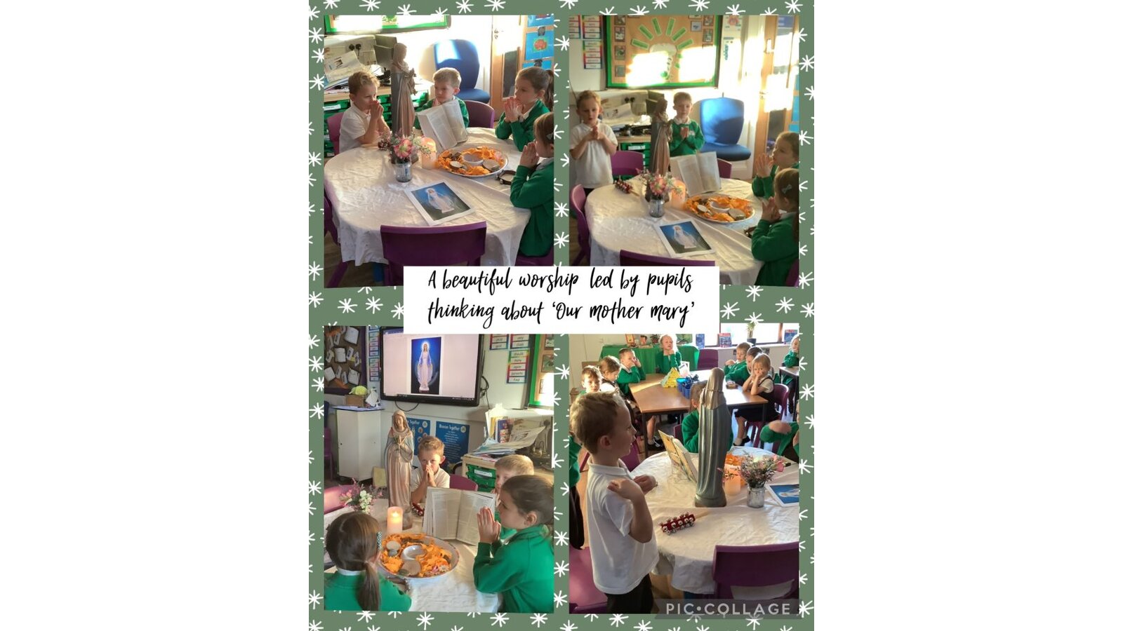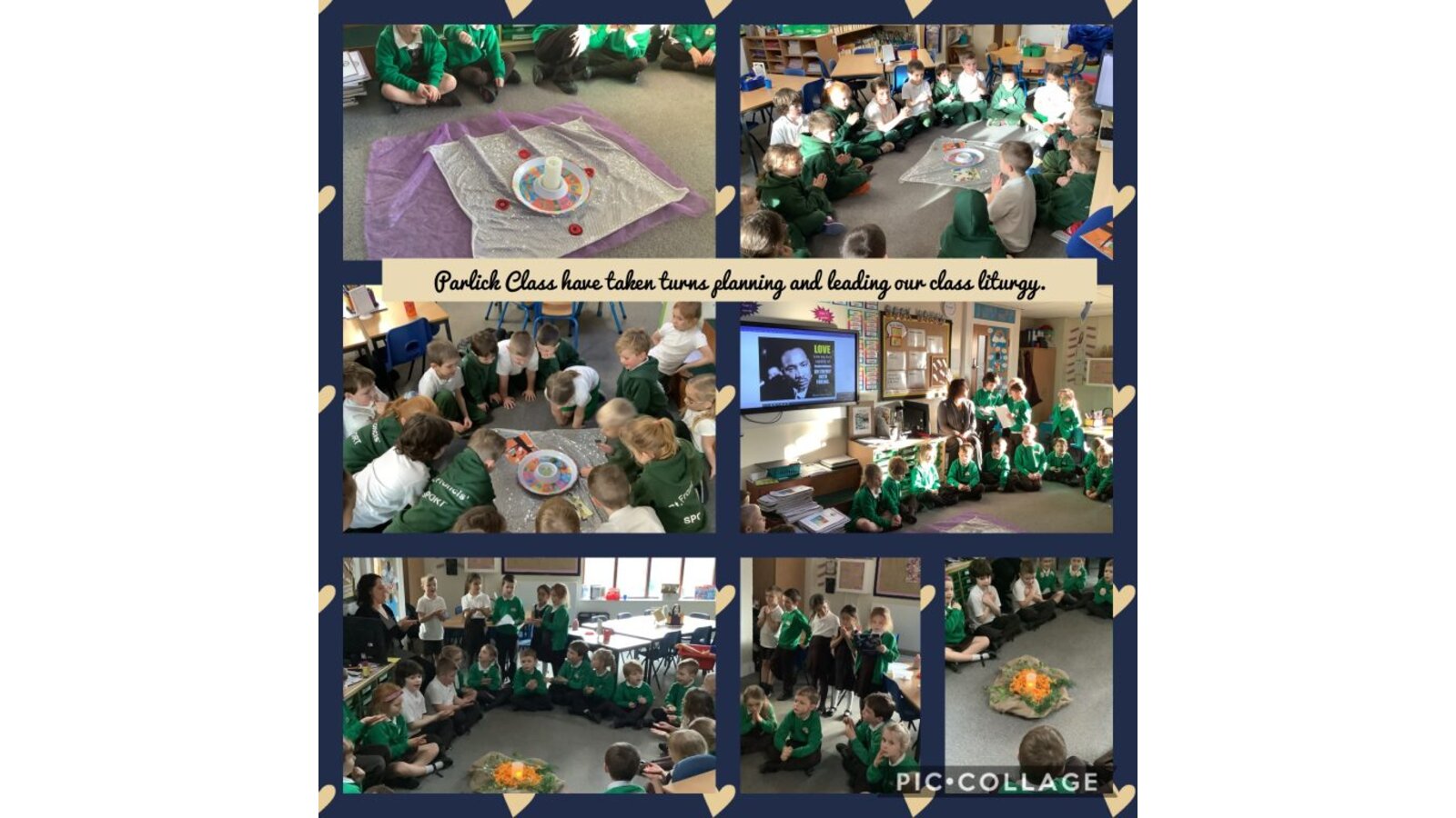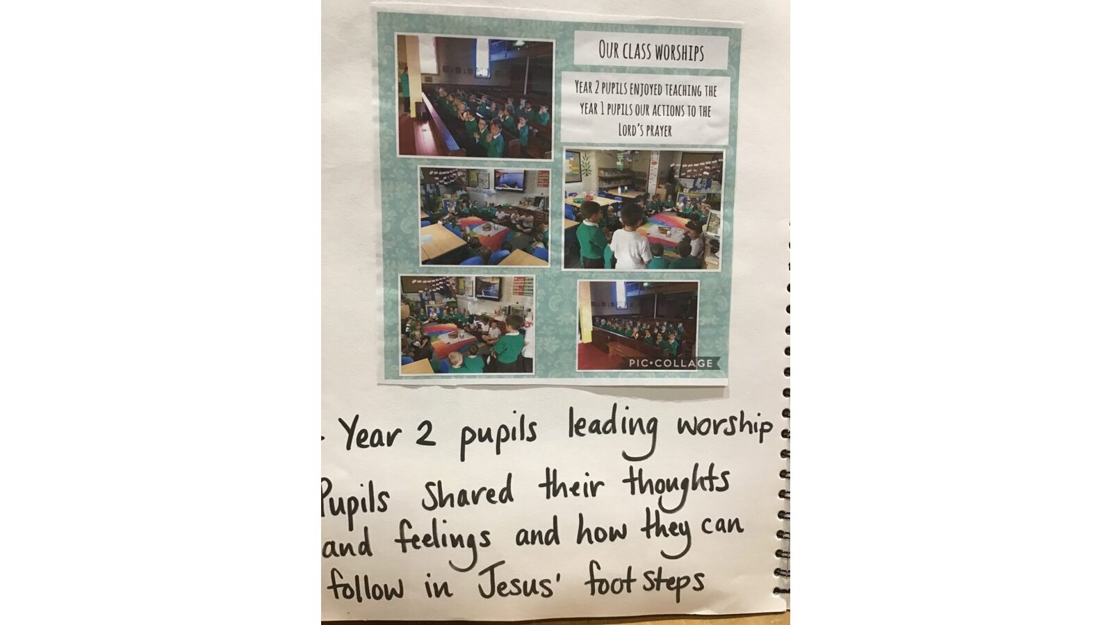 Collective Worship across every class uses the same structure. We gather, using prayers or actions or music. We encourage children, who play musical instruments to use their talents in the gather part of the worship, to set the mood and calmly engage their peers. We then listen to scripture readings. We reflect on the meaning of the scripture and something picture to consider what it is saying to us. Finally, we go forth by reflecting on the scripture and taking this forward into our work throughout the day. In each class, there is a prayer and liturgy book where pictures, planning templates and responses are kept as a reminder and record of the acts of worship.
