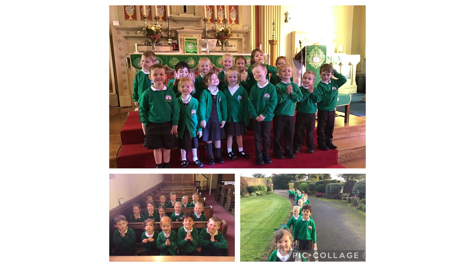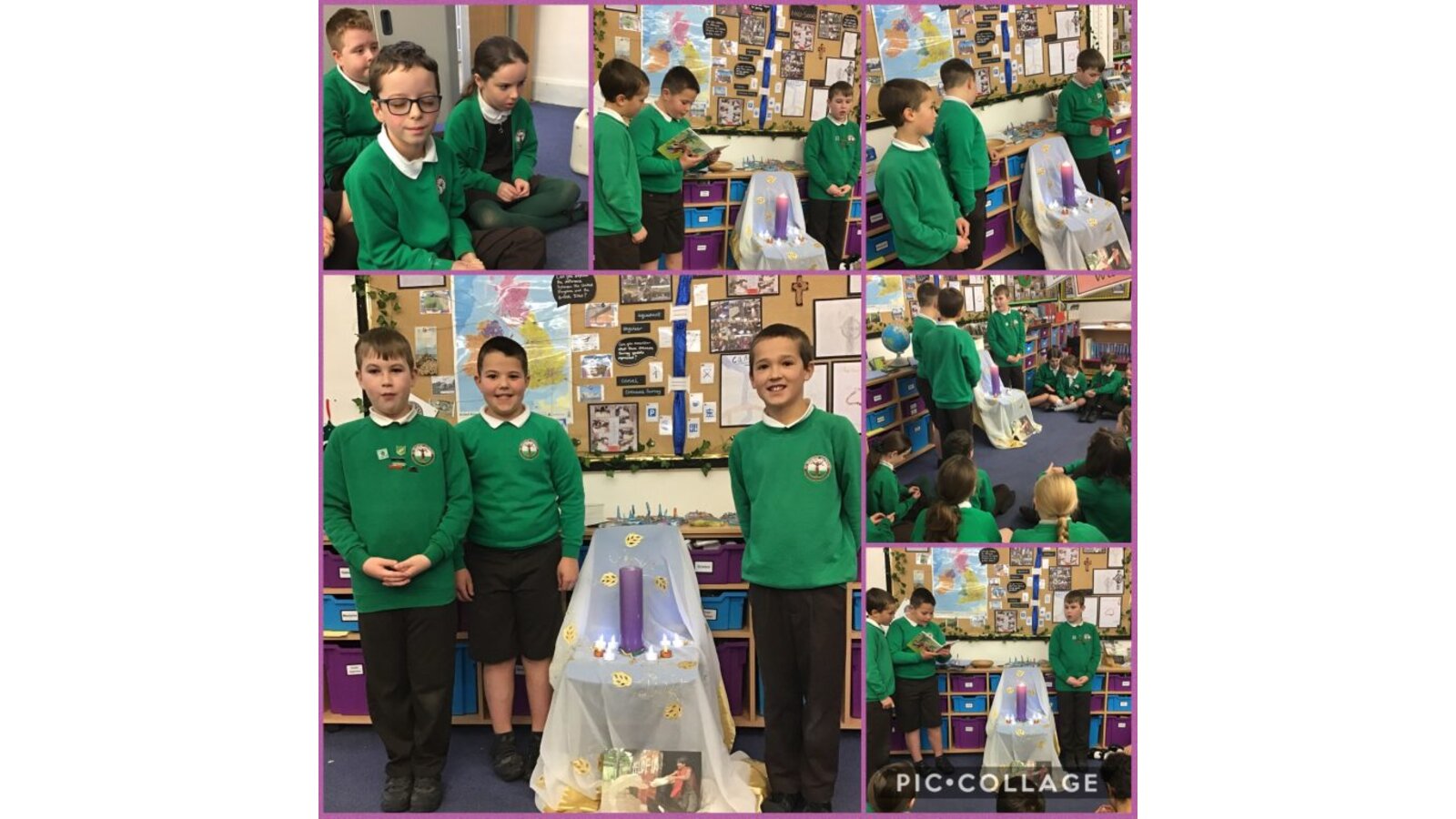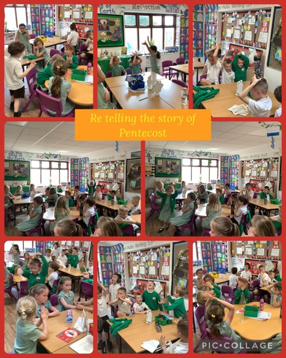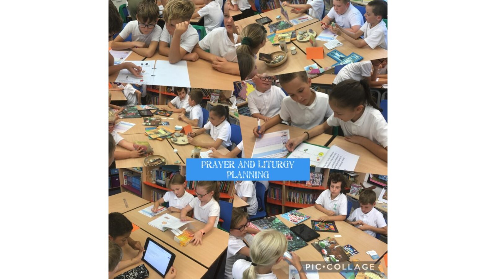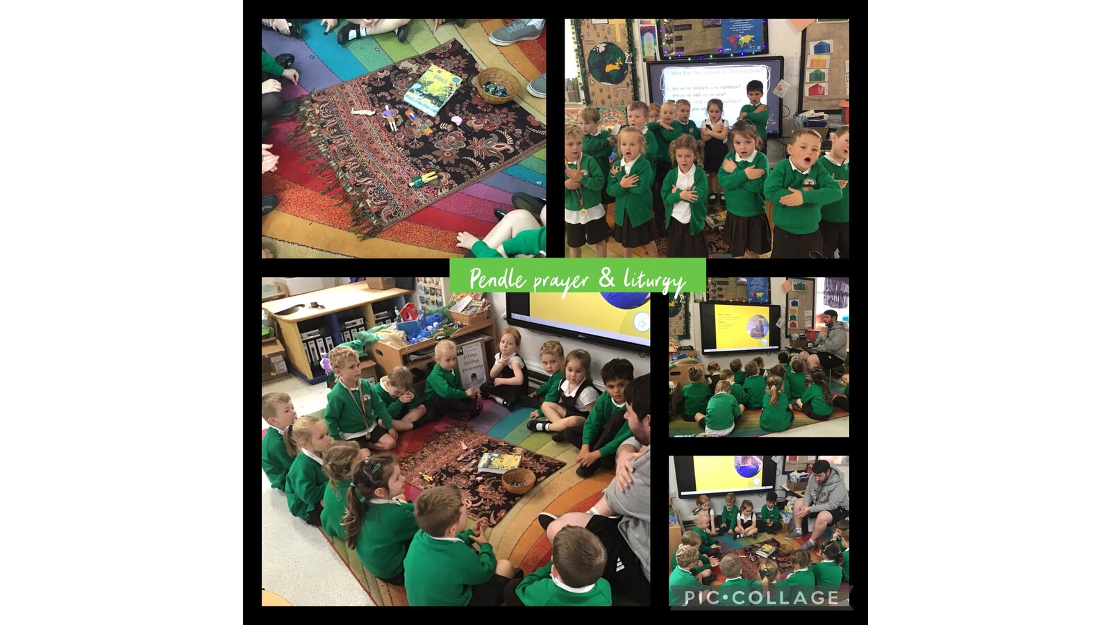 Collective Worship across every class uses the same structure. We gather, using prayers or actions or music. We encourage children, who play musical instruments to use their talents in the gather part of the worship, to set the mood and calmly engage their peers. We then listen to scripture readings. We reflect on the meaning of the scripture and something picture to consider what it is saying to us. Finally, we go forth by reflecting on the scripture and taking this forward into our work throughout the day. In each class, there is a prayer and liturgy book where pictures, planning templates and responses are kept as a reminder and record of the acts of worship.