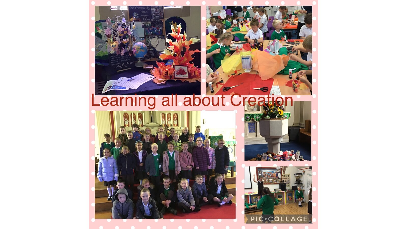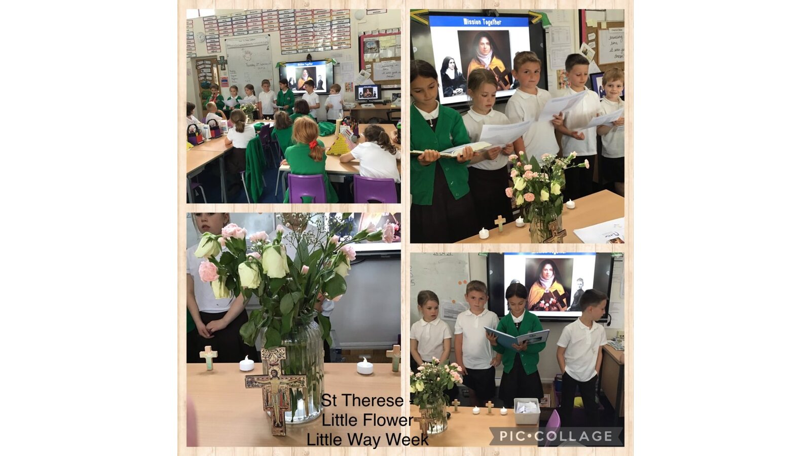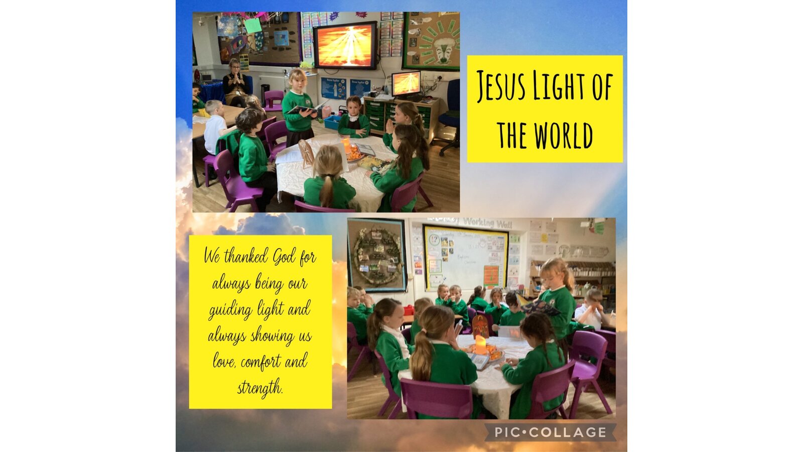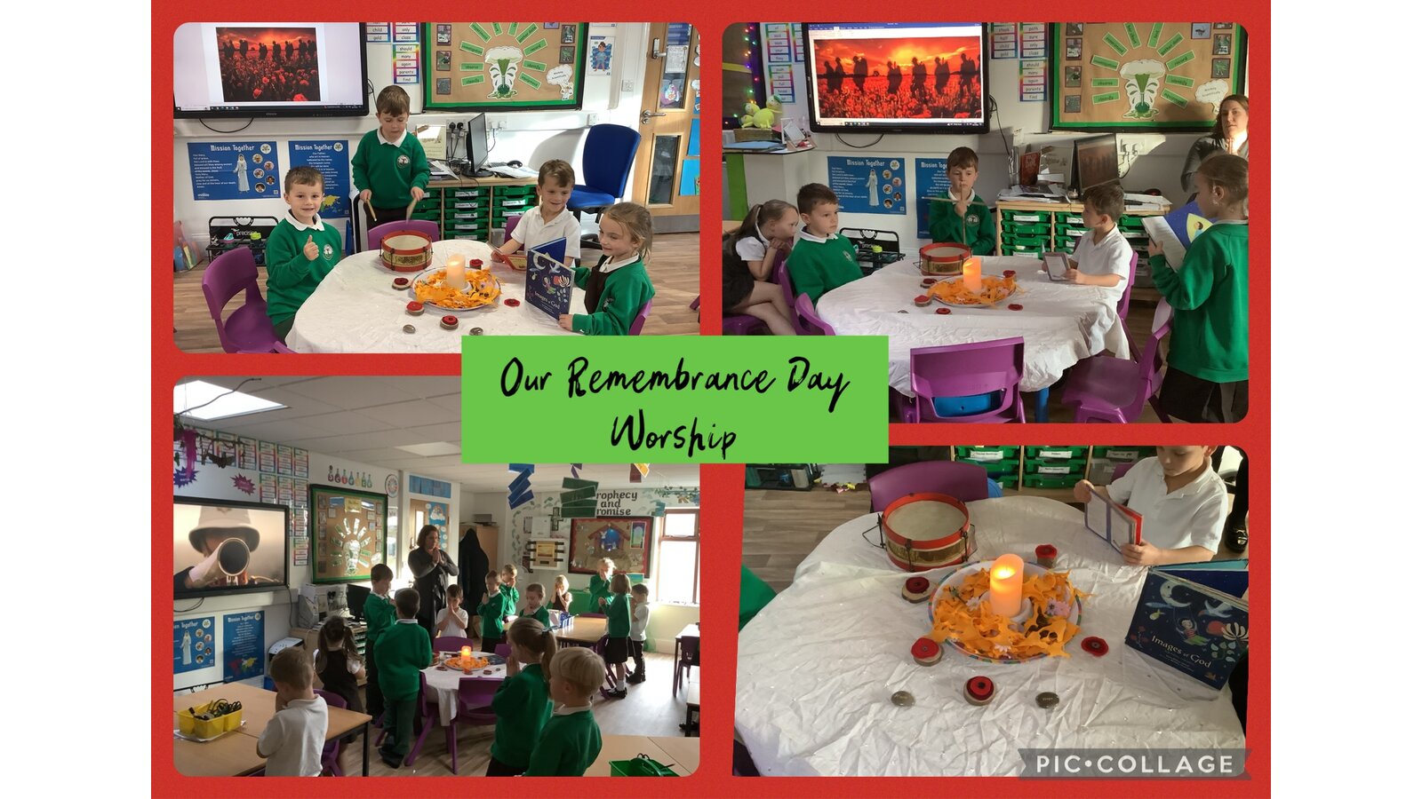Collective Worship across every class uses the same structure. We gather, using prayers or actions or music. We encourage children, who play musical instruments to use their talents in the gather part of the worship, to set the mood and calmly engage their peers. We then listen to scripture readings. We reflect on the meaning of the scripture and something picture to consider what it is saying to us. Finally, we go forth by reflecting on the scripture and taking this forward into our work throughout the day. In each class, there is a prayer and liturgy book where pictures, planning templates and responses are kept as a reminder and record of the acts of worship.