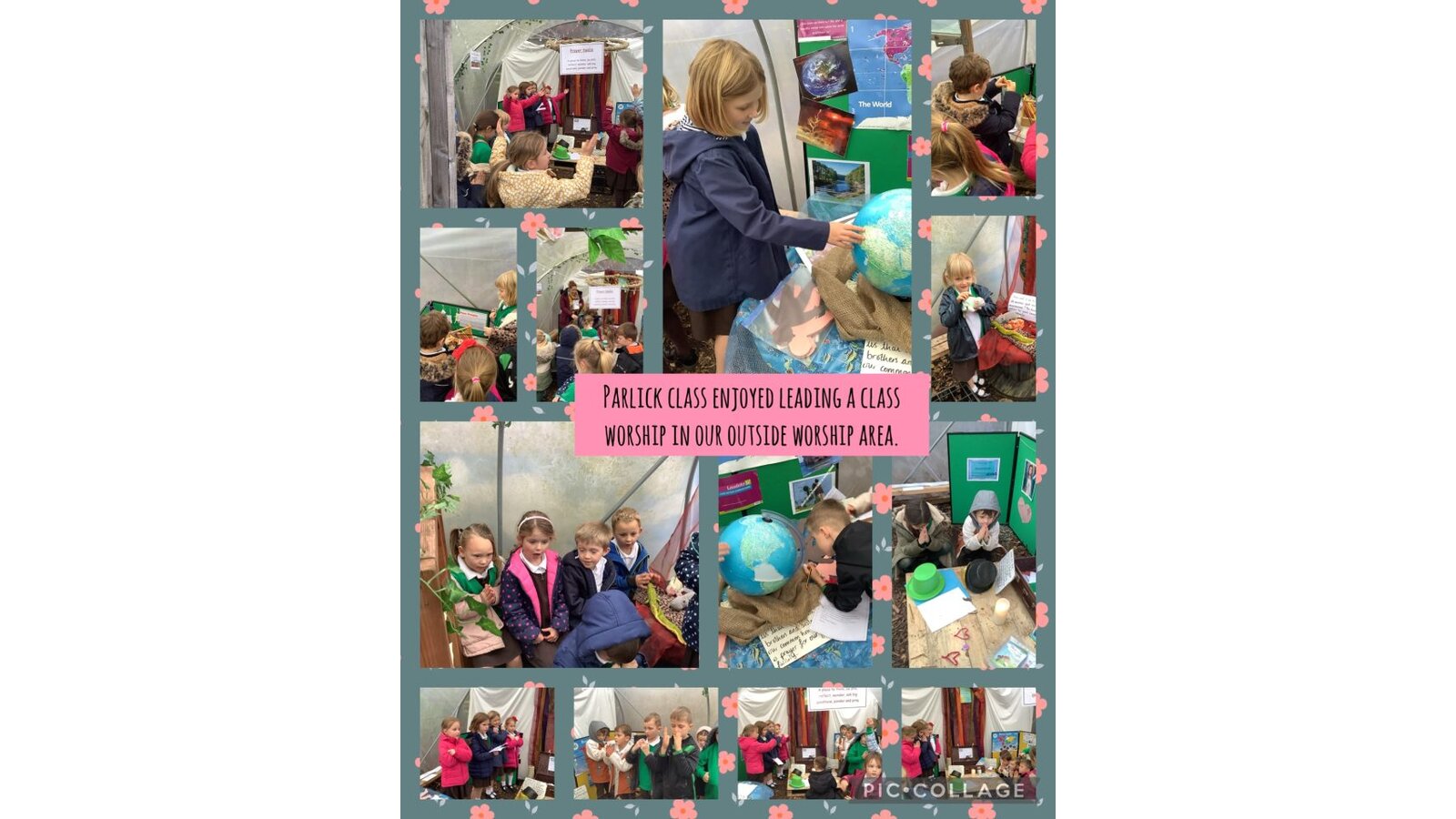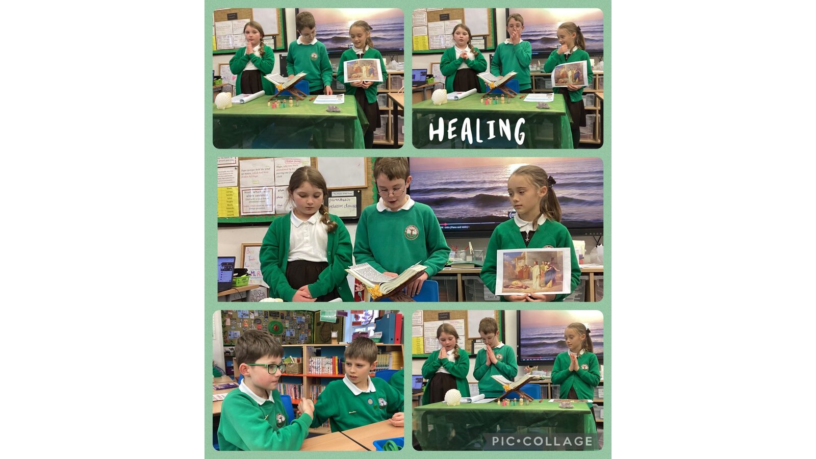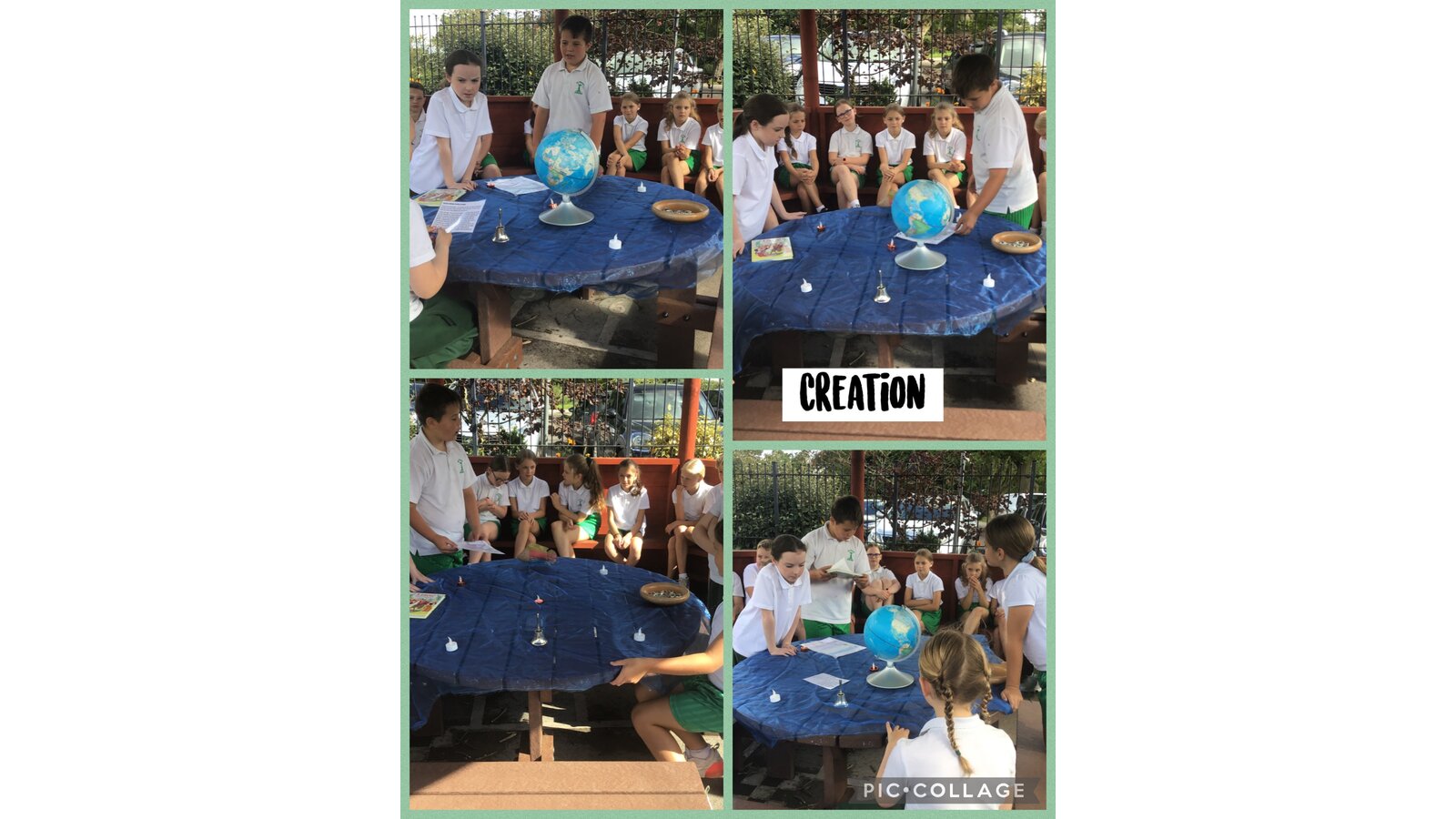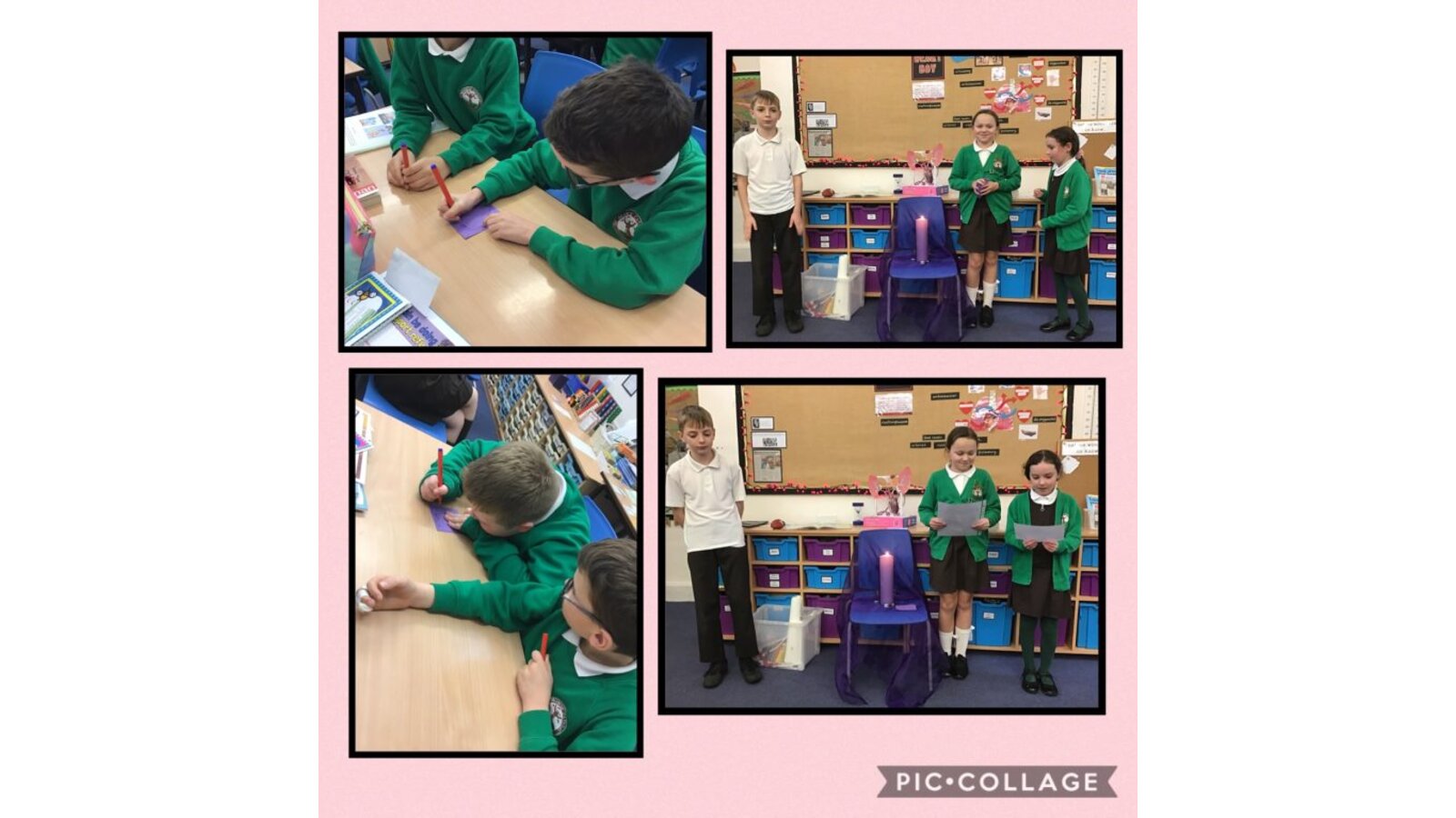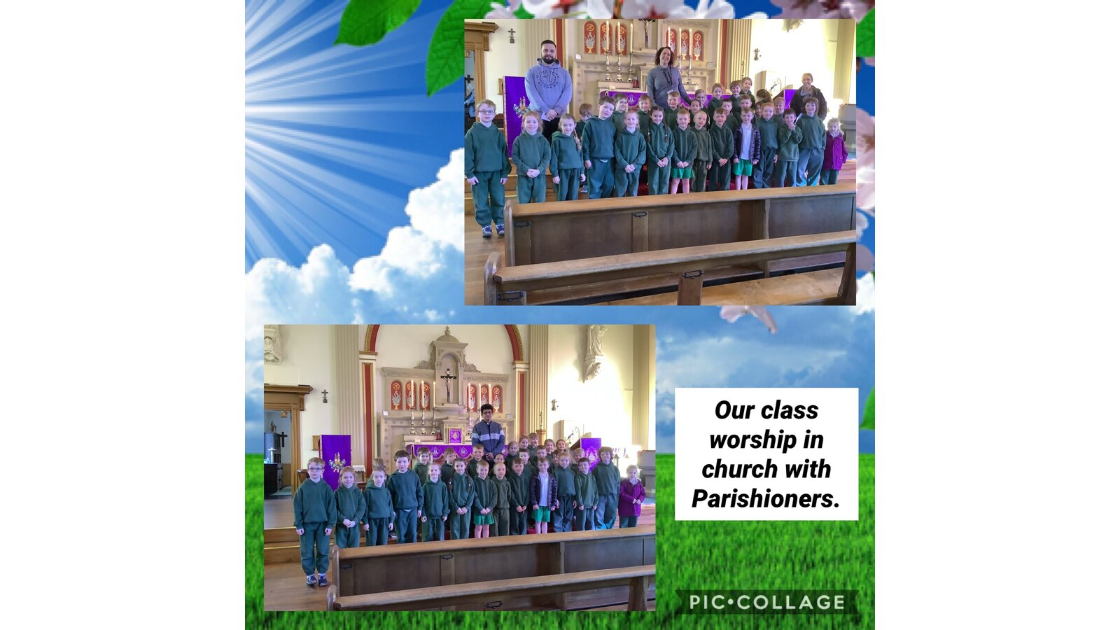 Collective Worship across every class uses the same structure. We gather, using prayers or actions or music. We encourage children, who play musical instruments to use their talents in the gather part of the worship, to set the mood and calmly engage their peers. We then listen to scripture readings. We reflect on the meaning of the scripture and something picture to consider what it is saying to us. Finally, we go forth by reflecting on the scripture and taking this forward into our work throughout the day. In each class, there is a prayer and liturgy book where pictures, planning templates and responses are kept as a reminder and record of the acts of worship.
