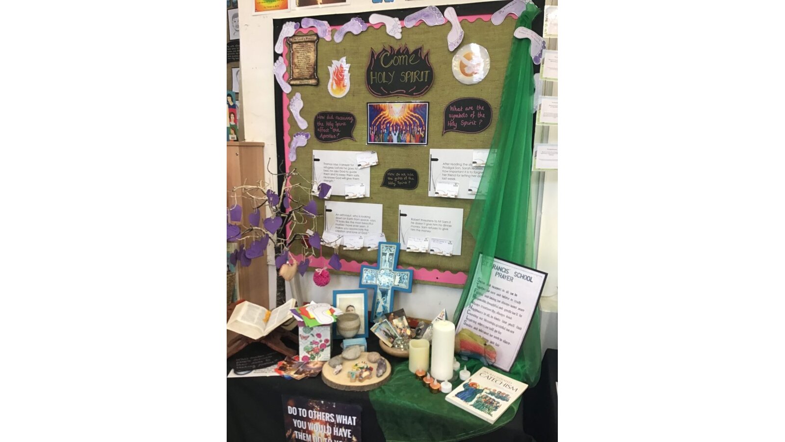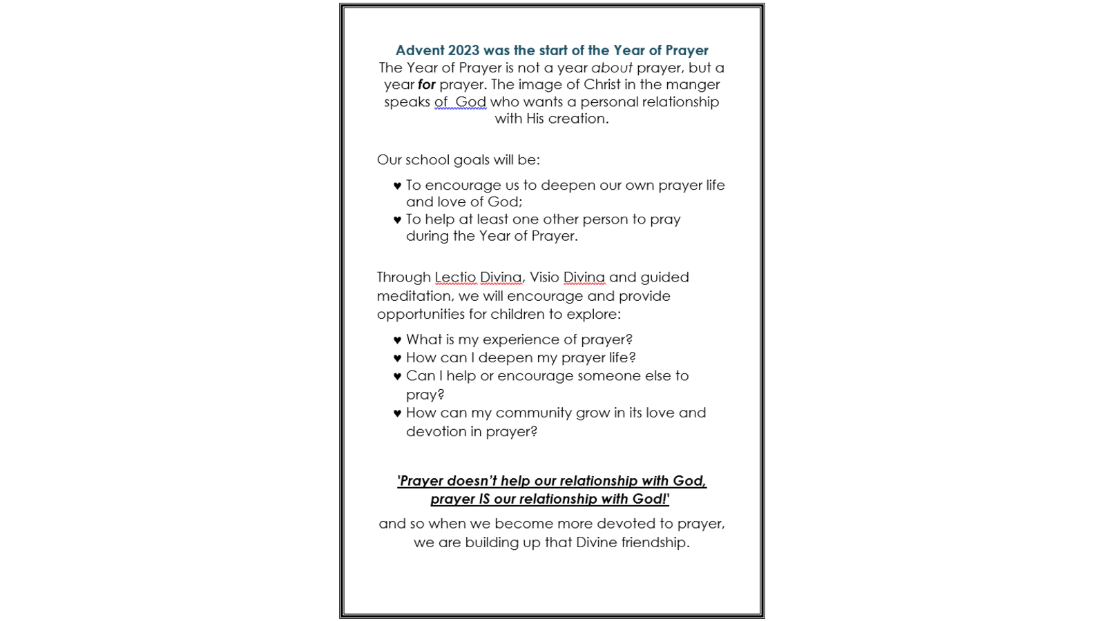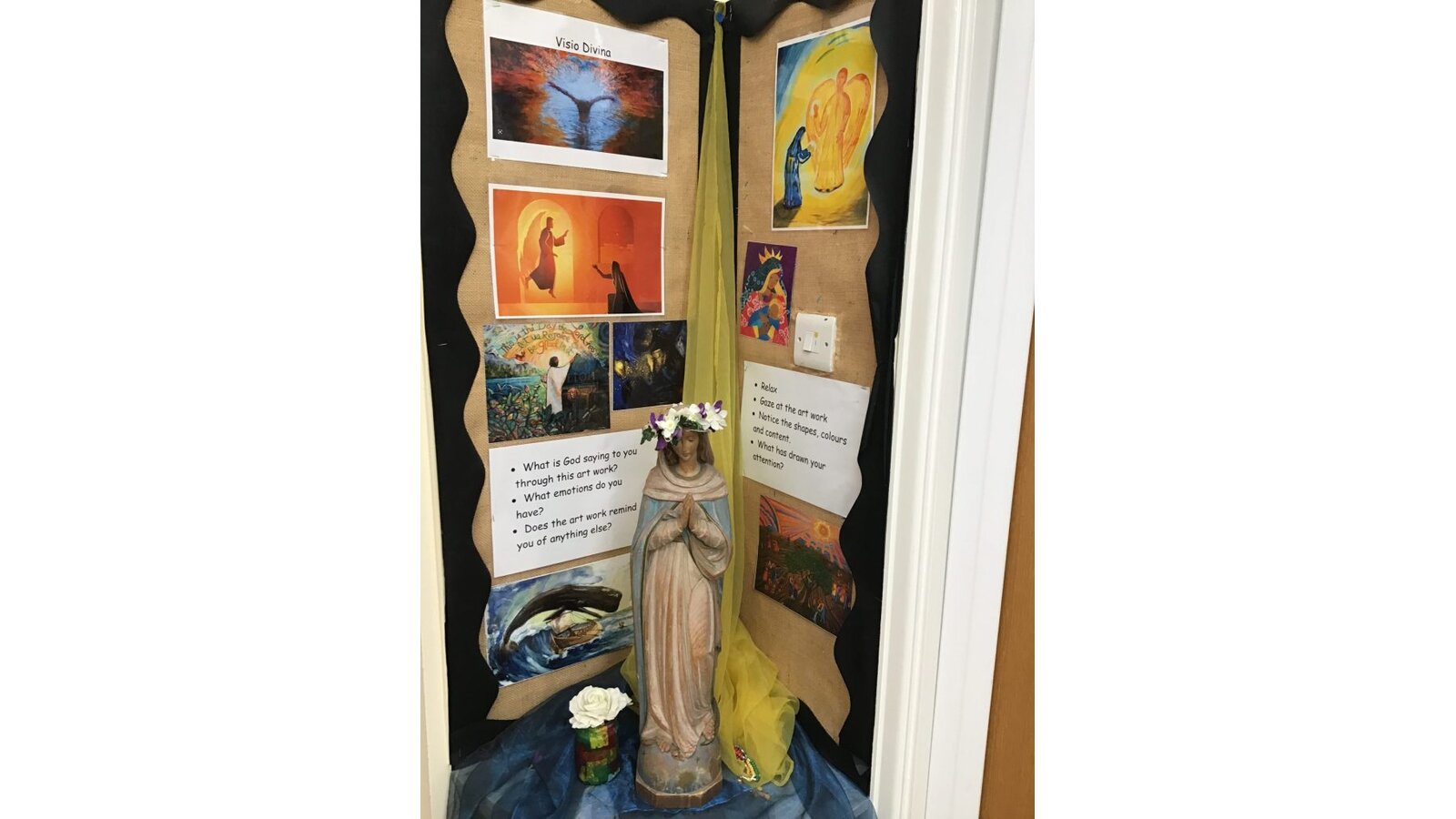 Each child takes part in a daily act of worship that lasts for 10 minutes. Traditional and formal prayers are used at lunchtime and to open and close the school day sessions. The children also plan and lead acts of worship within each of their classes. This happens daily and the children from Year 3 lead Lectio Divina and we are beginning to incorporate Visio Divina to further enhance and deepen our experiences with God.