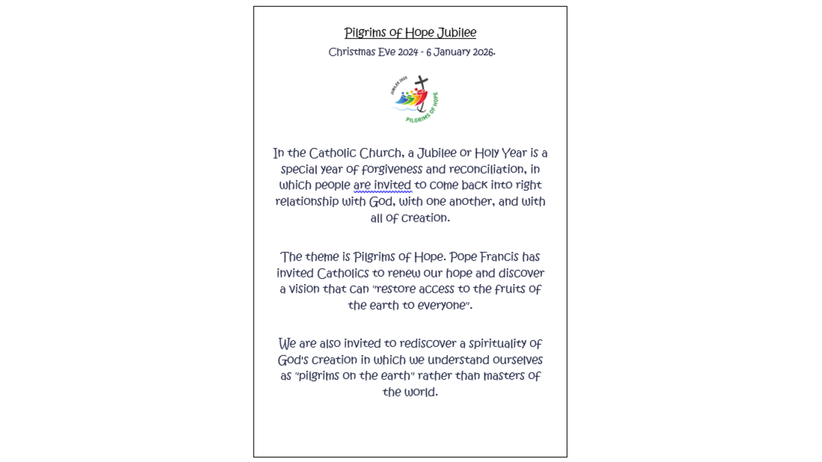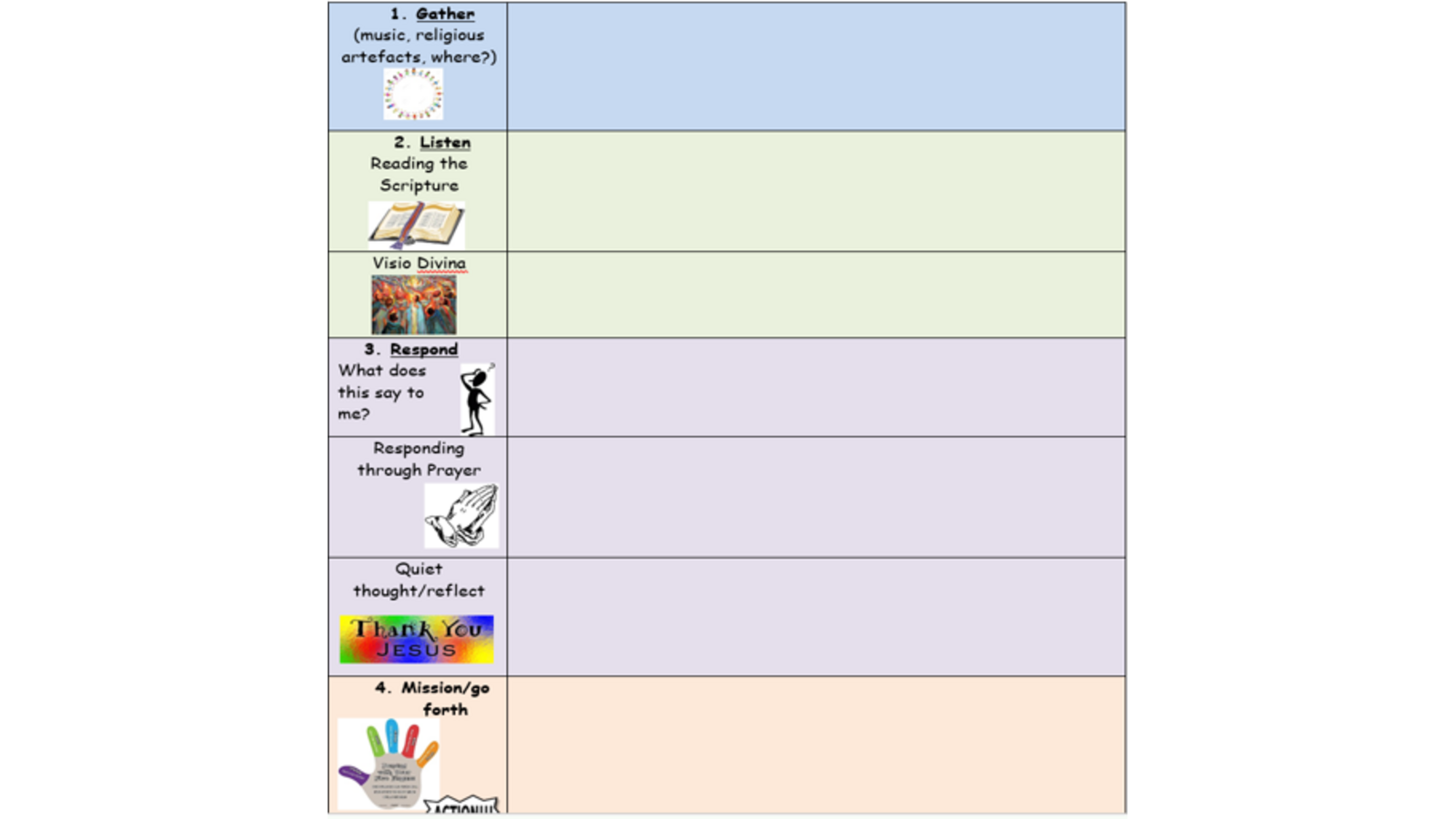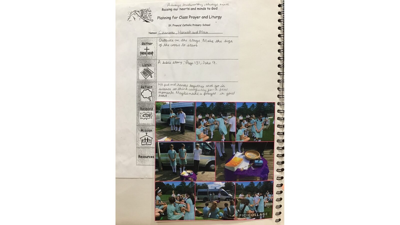 Each class has a rota for leading prayer and liturgy and four children come together to plan the special worship time for the rest of the class. There are four children to correspond with the four parts of our prayer and liturgy structure and each class has four separate packs of resources to support the children’s independence and leading of the worship. The children use this template to plan and ensure careful connection with the class to enable the scripture to reach and touch each individual child. This is all part of deepening our relationship with God and developing our human person.