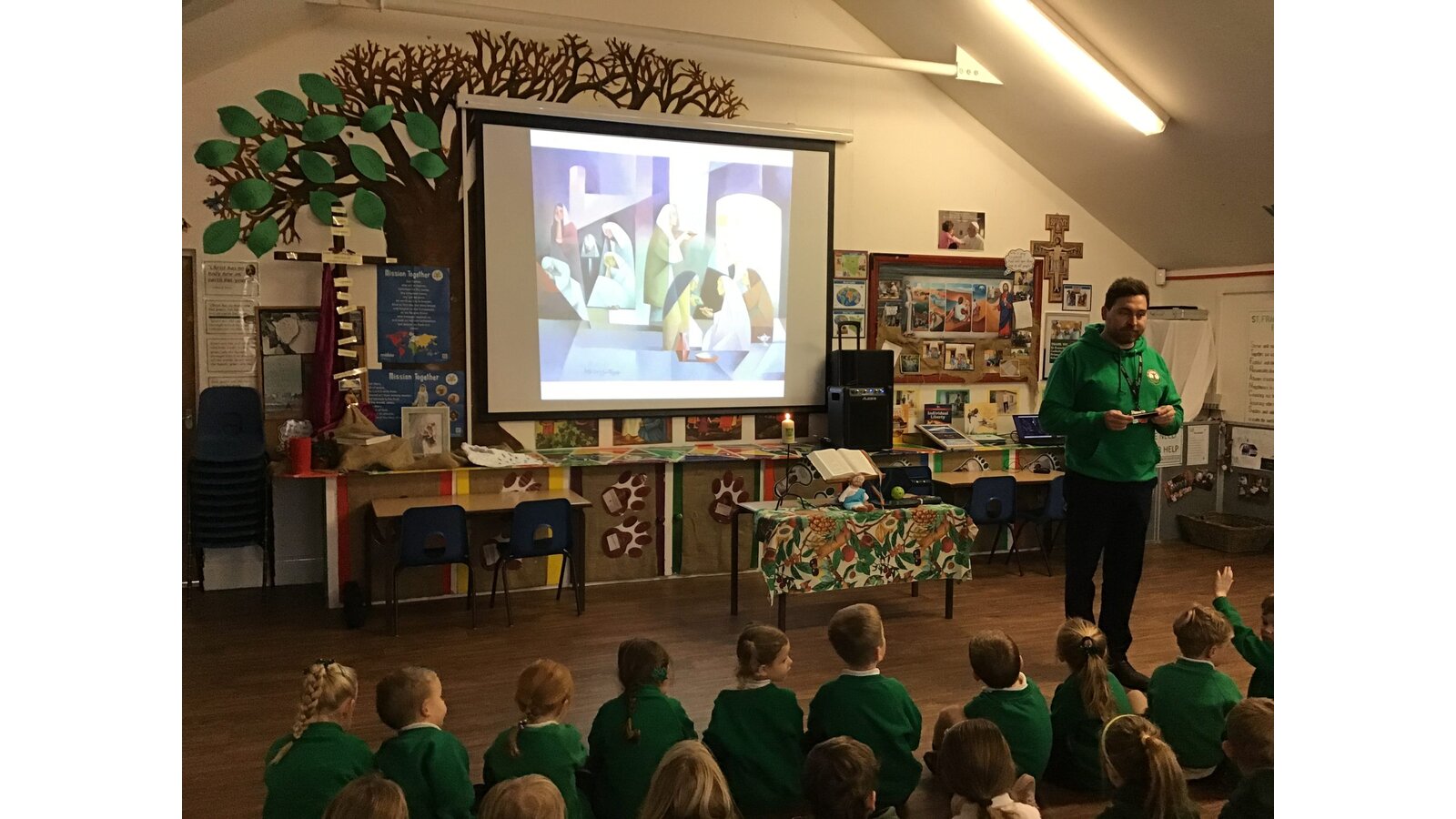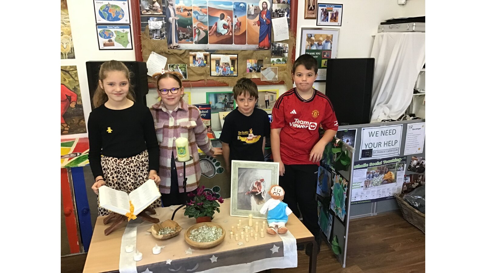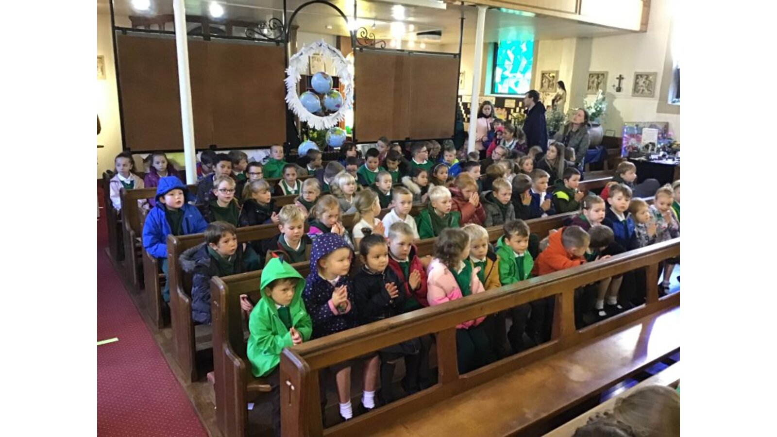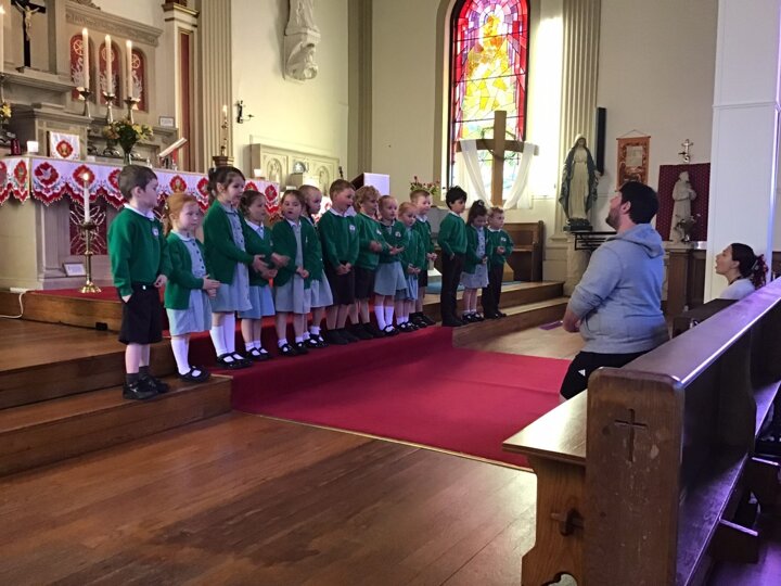 Every Monday morning, Miss Deakin leads the assembly base on the Sunday Gospel and this follows the liturgical year. The children are active participants and displays in the hall support the teachings of the assembly. Every Tuesday, we have class mass and Fr Sony leads us in church. Each Friday morning, Miss Deakin leads Golden award celebration assembly and the children enjoy learning traditional hymns and engaging songs. Sometimes, we have a focus which the children will lead, especially if they have planned a charity event and the children will also present to the whole school as party of care for our common home.
